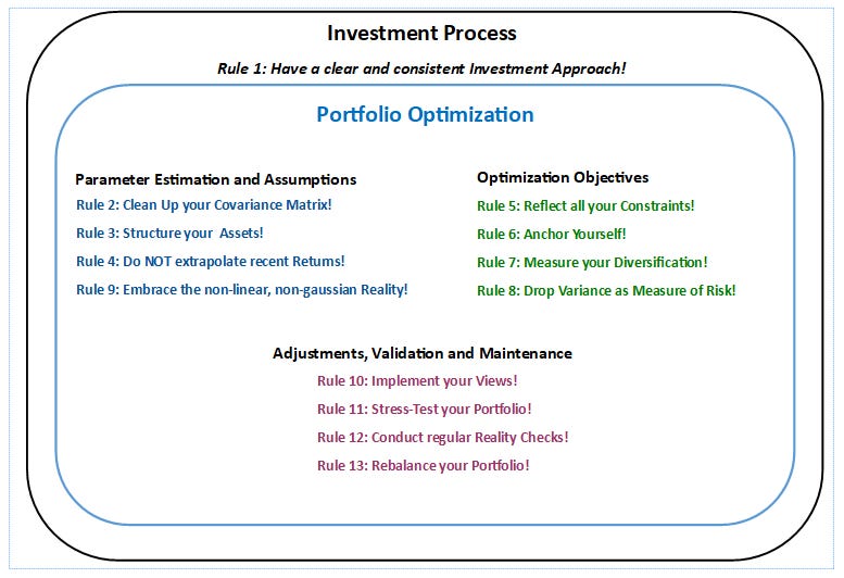 Portfolio optimization as instrument to determine the allocation of assets in a portfolio is often criticized for being impractical in real-world investing. In this article, we present 13 useful rules to address these challenges and make portfolio optimization more effective and user-friendly. By debunking common myths, we offer strategies that can be applied by both institutional and individual investors. The rules are designed to enhance decision-making, mitigate risks, and incorporate investor preferences, ensuring that portfolio optimization is a valuable tool for achieving long-term investment goals. Future articles will explore each rule in more detail, with real-world examples and Python code to guide implementation.